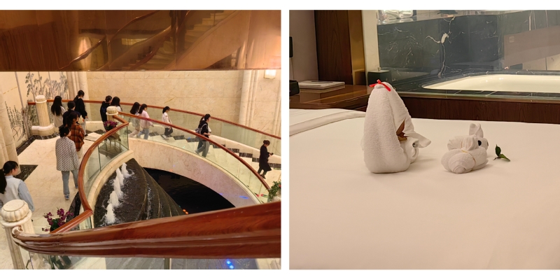 见面会结束后,在兰溪世贸大饭店各管理人员的带领下,同学们分组对酒店进行参观,更加深入了解酒店前台、餐饮、客房、商务会议等功能模块。智慧套房、健身房、宴会厅等设施让同学们进一步感受到兰溪世贸大饭店在服务接待上的人性化和高品质化,清晰的认识到将企业文化与企业实践相结合才能推动酒店发展。