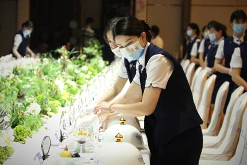晚宴伊始,同学们按照餐饮服务的标准以及酒店方的各项要求,迅速整理仪容仪表、回顾服务要点、进行现场彩排站位模拟等,为此次晚宴的顺利进行做了充足的准备。