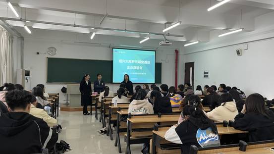11月12日上午,文旅讲坛第13讲在我校2号楼312教室举行。本讲座邀请到绍兴大禹开元观堂酒店人力资源总监尉宵宵、人力资源部副总监褚文君,为旅游管理专业学子带来《“职”等你来》企业宣讲会,本次讲座由旅游管理协会主办,张闻羽、赵玉琪两位专业教师主持。
