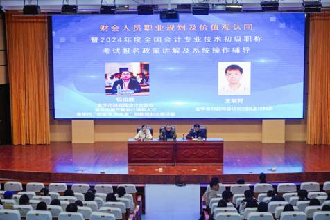 为帮助同学们树立长远职业规划和激发大家报名参加初级会计技术资格考试的兴趣,1月3日下午,会计学专业特别邀请了金华市财政局会计处包俊胜处长和王展芳主任,在行政楼报告厅做财会人员职业规划及价值观认同和2024年初级会计资格考试报名辅导的讲座。讲座由商学院副院长彭红英老师主持,会计学专业老师和会计学、财务管理等专业430多位学生参加了讲座。