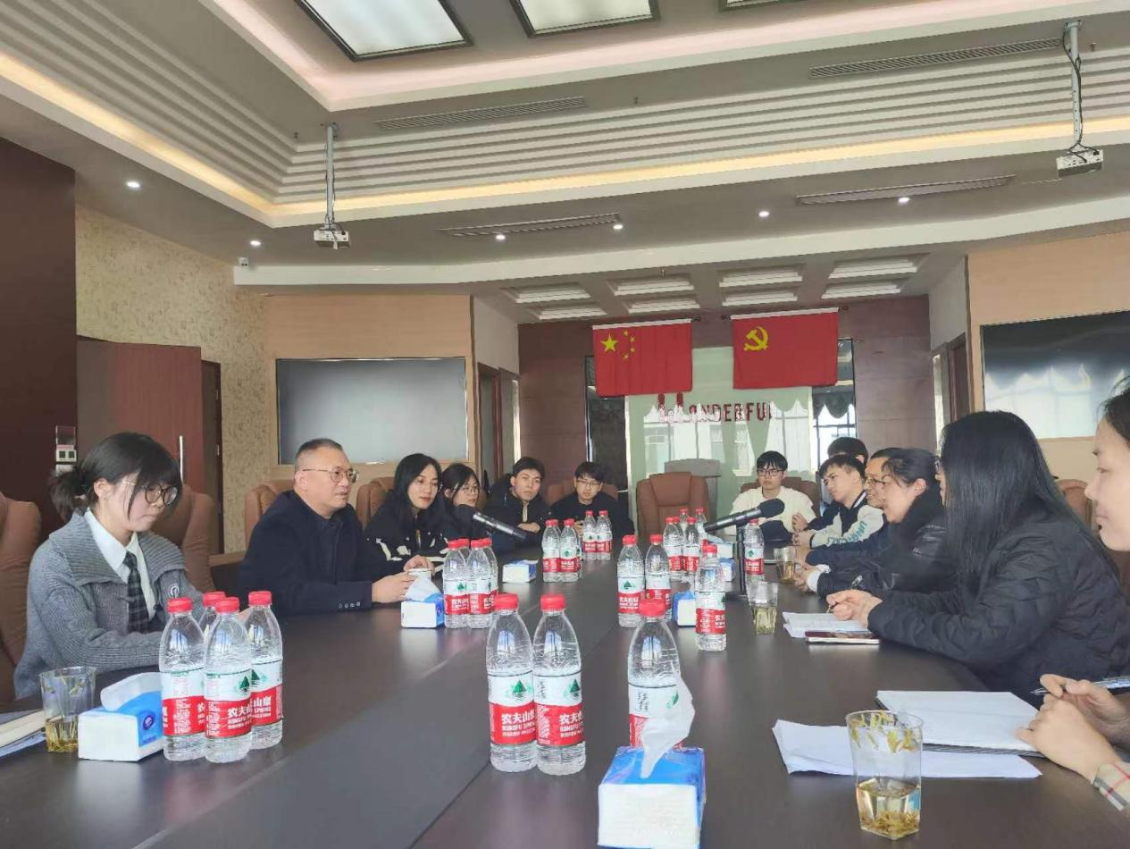 张一为对公司情况进行了介绍,公司成立于2004年,是一家集研发、生产、加工及销售为一体的现代化大型生产企业,公司已建成智能化控制中心,具有成熟的跨境电商队伍,注重企业文化建设,并希望进一步深化校企合作。人事部毛经理介绍了公司对实习生的培养情况,要求学生要沉下心来做事,更好地适应工作环境。