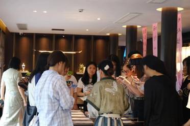 次日,专业师生首先参观了浙江首家沉浸式宋韵非遗文化主题餐厅——宋韵·婺州府。在此,学生们通过聆听讲解员的细致解说、观摩焚香技艺的现场展示,参与DIY团扇等体验活动,切身感受到将餐饮与文化体验进行场景融合的独特魅力。
