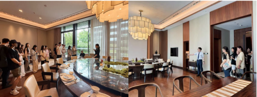 随后,两位人事部专员分组带领班级深入参观酒店各区域。从酒店外围环境的功能规划,到内部空间的服务动线,专员边走边讲:解析园林景观与客房体验的协同设计,阐释大堂接待流程中的服务要点。踏入婺州厅,学生直观感受大型宴会场地的筹备规范;驻足中西餐厅,同学们实地了解餐位布局、菜品款式与特色服务设计要点,细节里的“服务门道”逐一明晰。从空间设计到服务文化,同学们进一步体会到金华君澜酒店对中国式服务和地方文化的深刻理解。